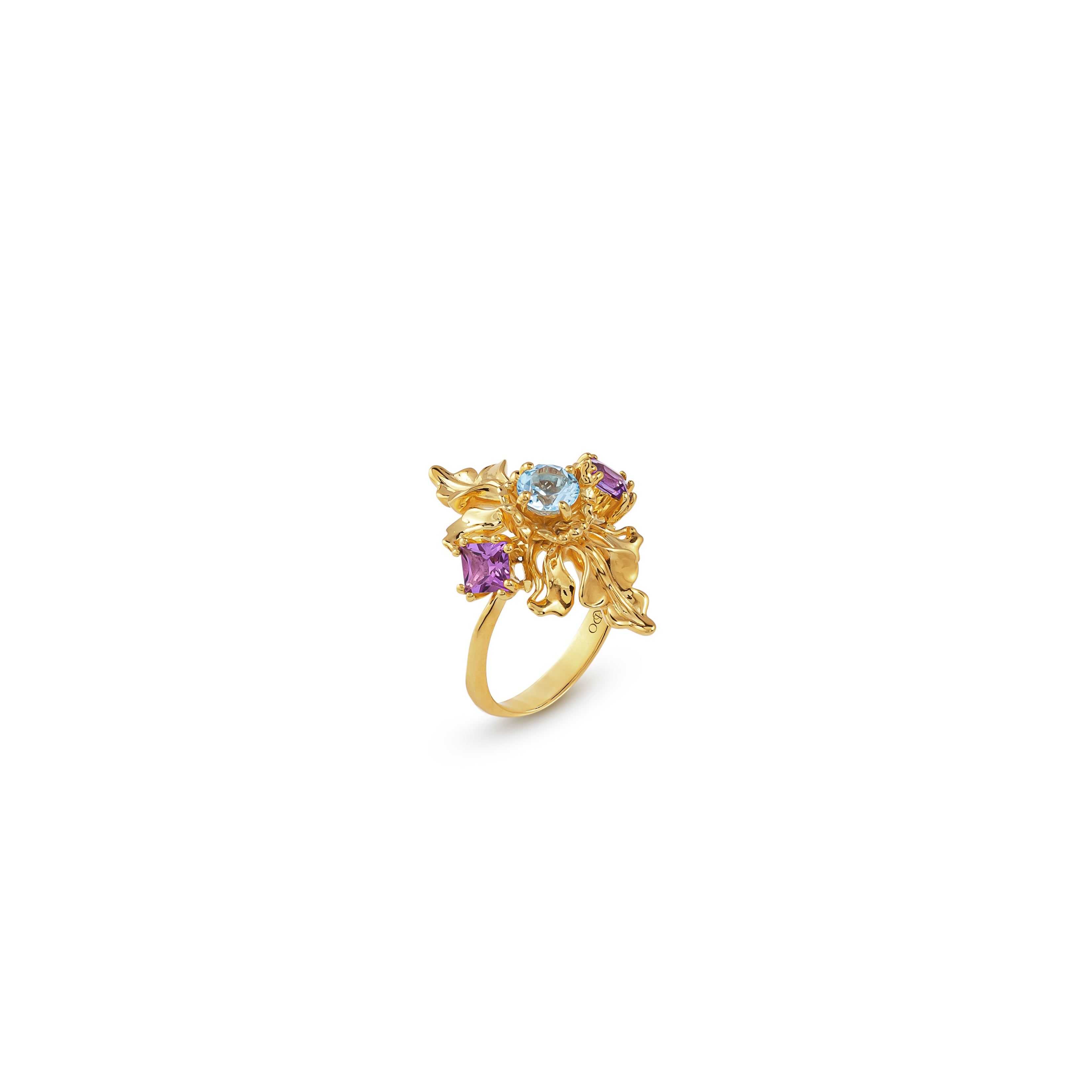 925 silver ring plated with 18kt gold. 2 square cut Amethysts (total 0.62 ct) and 1 round cut Blue Topaz (total 0.65 ct).