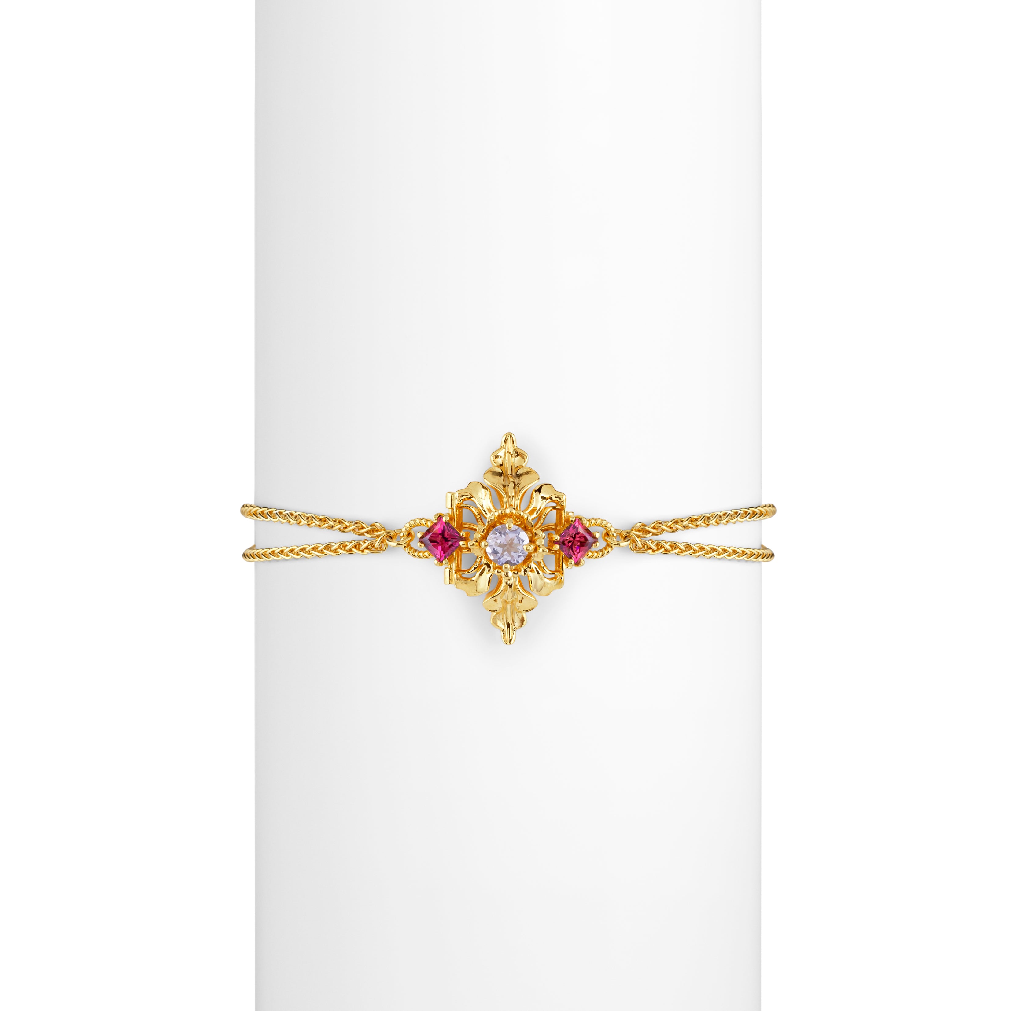 Bracelet in 925 silver plated with 18 kt gold. 2 square princess cut Rhodolite Garnets (total 0.86 ct) and two round cut Iolites (total 1.12 ct)