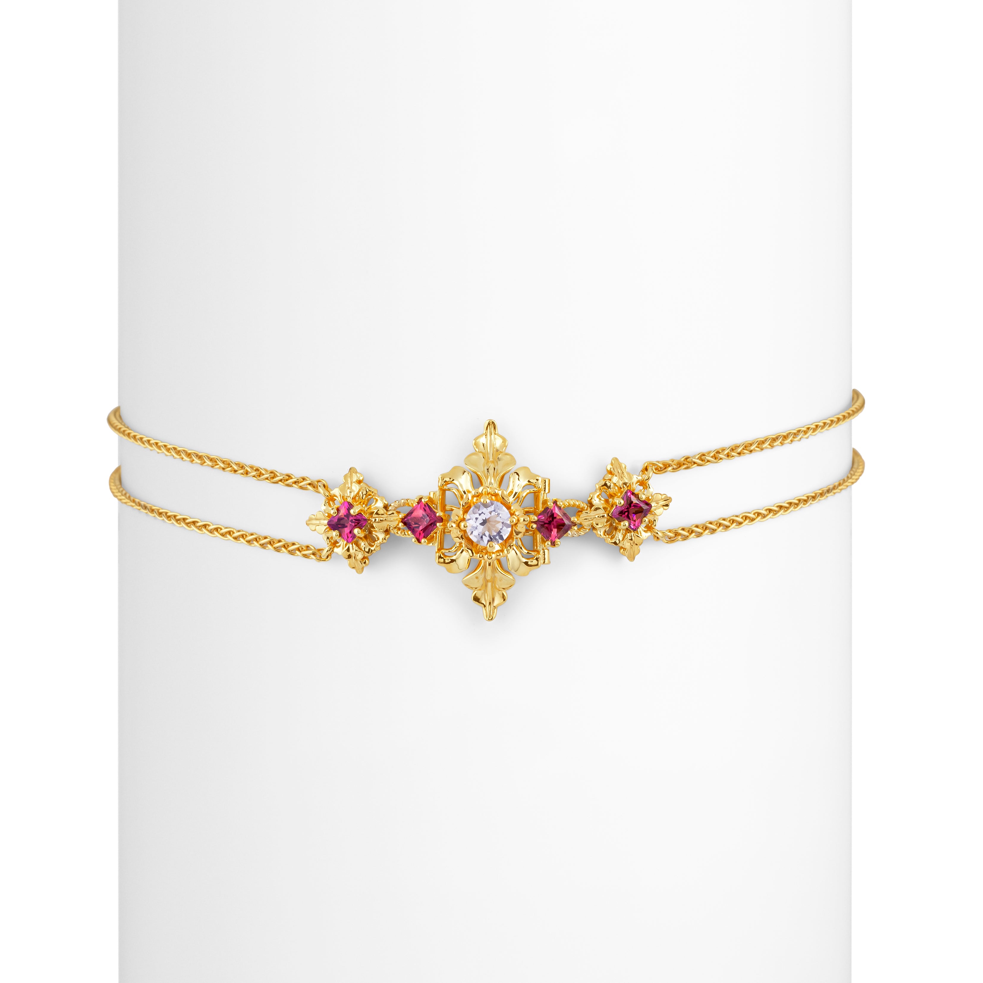925 silver necklace plated with 18 kt gold. 4 square princess cut Rhodolite Garnets (total 1.72 ct) and two round cut Iolites (total 1.12 ct).