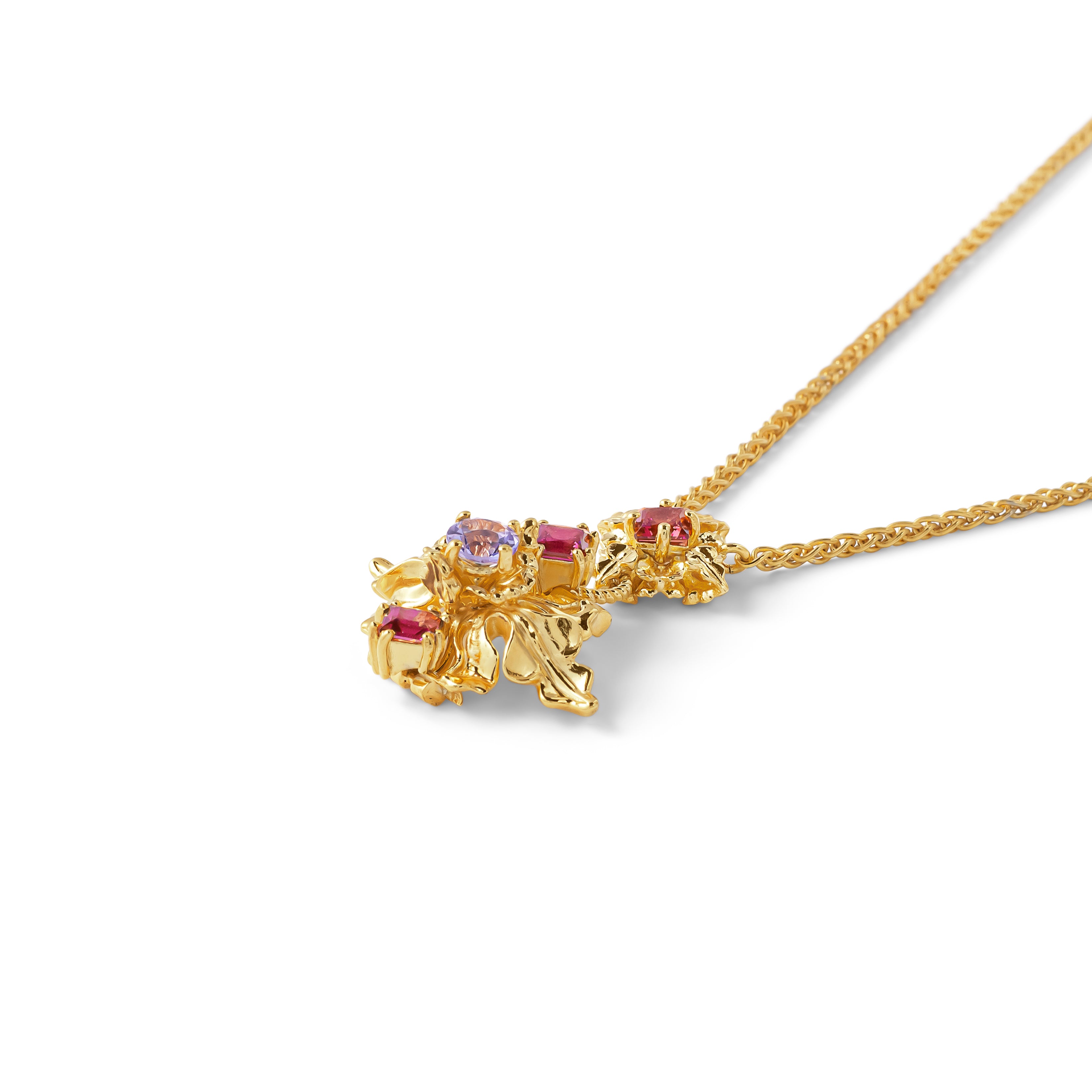 Pendant in 925 silver plated with 18 kt gold. 3 square princess cut Rhodolite Garnets (total 1.29 ct). and a round cut Iolite (total 0.56 ct)