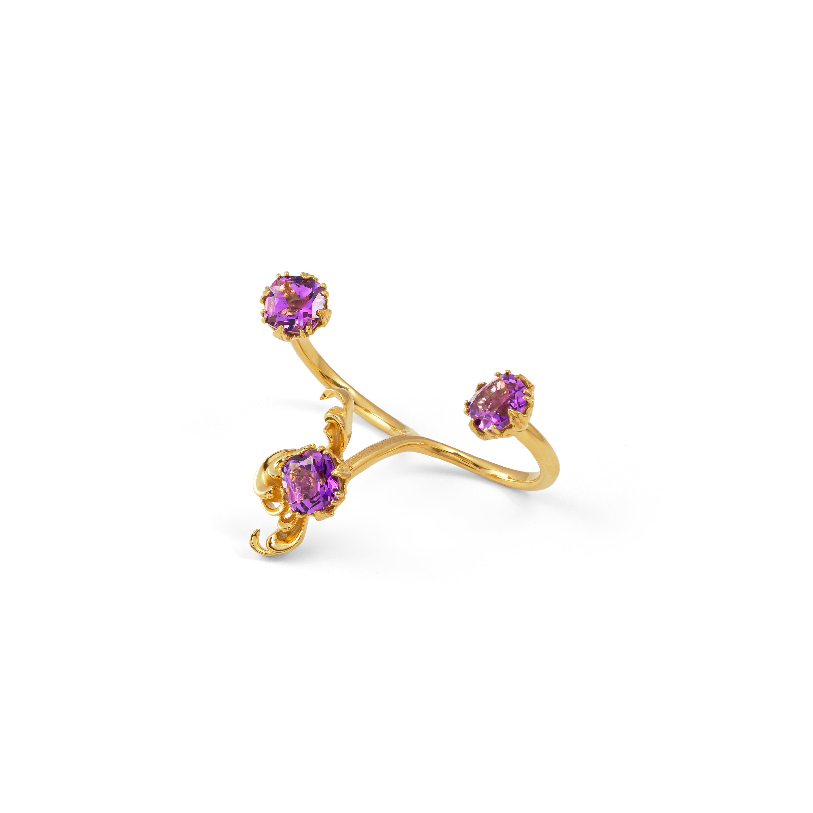 925 silver ring plated with 18 kt gold. 3 cushion cut amethysts (total 4.80 ct).