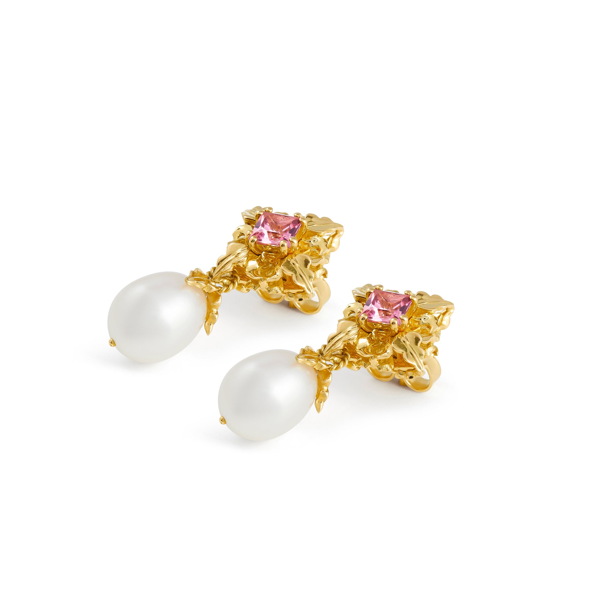 18 kt gold earrings with two princess-cut Pink Tourmaline and two natural white pearls.