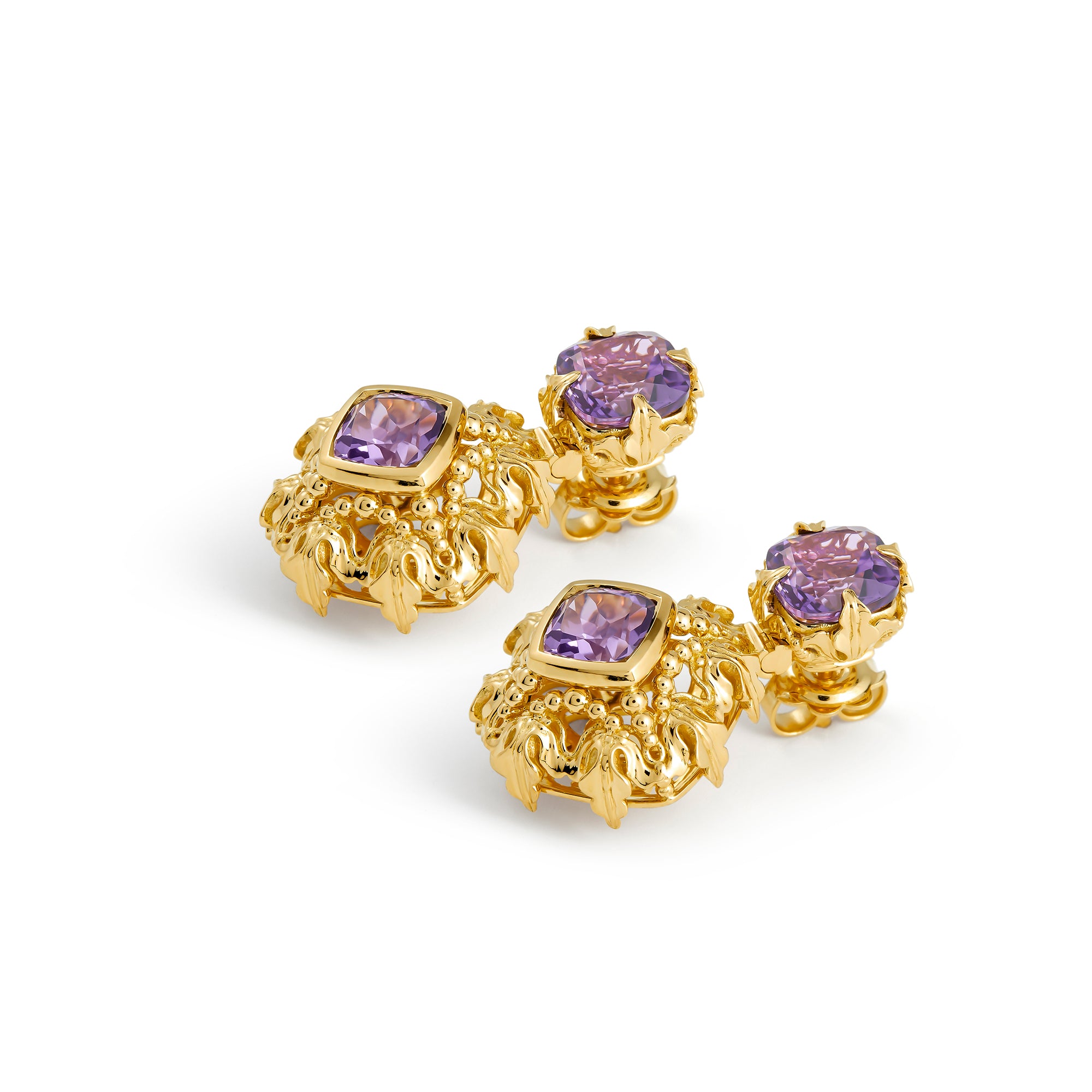 18 kt gold earrings with four cushion-cut Brazilian Amethysts (4.28 ct.)